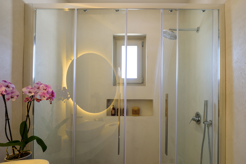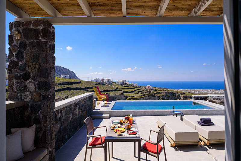 • Spacious bedroom with a private terrace overlooking the Aegean Sea.